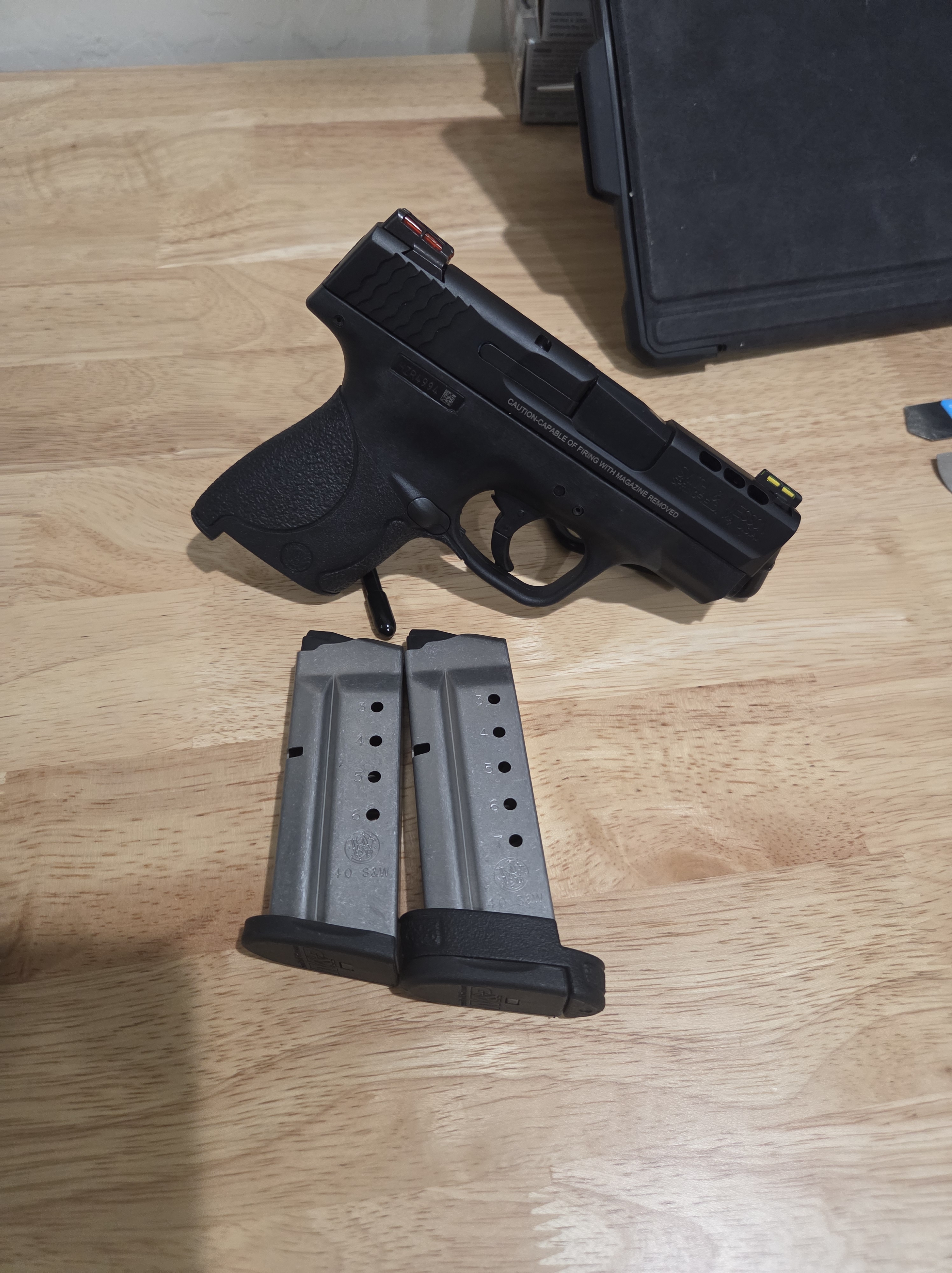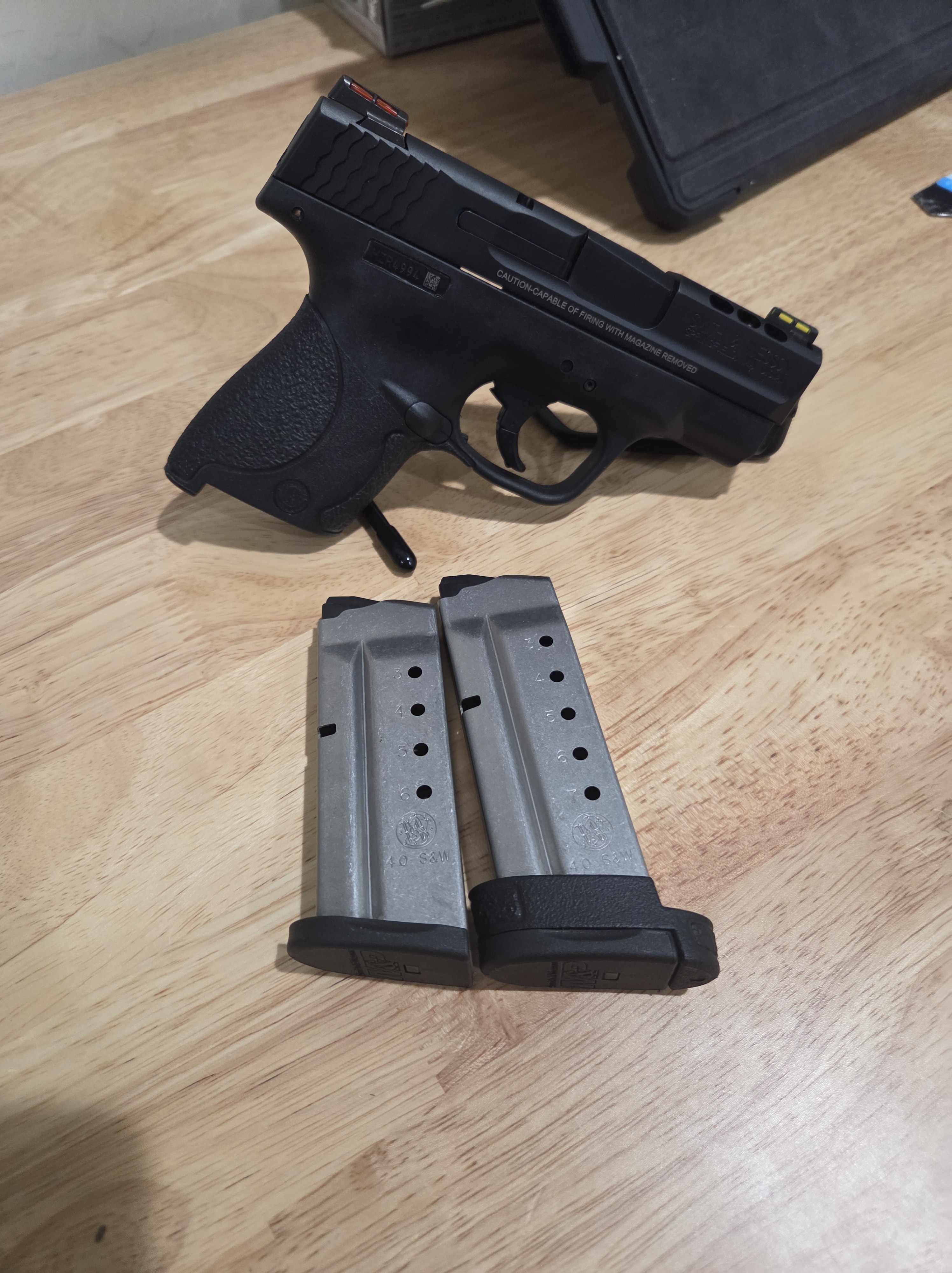 SMITH & WESSON M&P 40 SHIELD PERFORMANCE CENTER SEMI-AUTO PISTOL in .40S&W Caliber. Black compact polymer frame with enhanced trigger, ribbed thumb safety, ribbed slide release , ribbed take down lever, Textured magazine release button. Black Armonite coated PORTED stainless steel slide with rear cocking serrations and has Hi-Viz green rear sight and Hi-Viz red front sight. PORTED Stainless steel 3.1″ barrel. This gun comes with 1 – 6 round magazine and 31 – 7 round magazines with Finger rest.